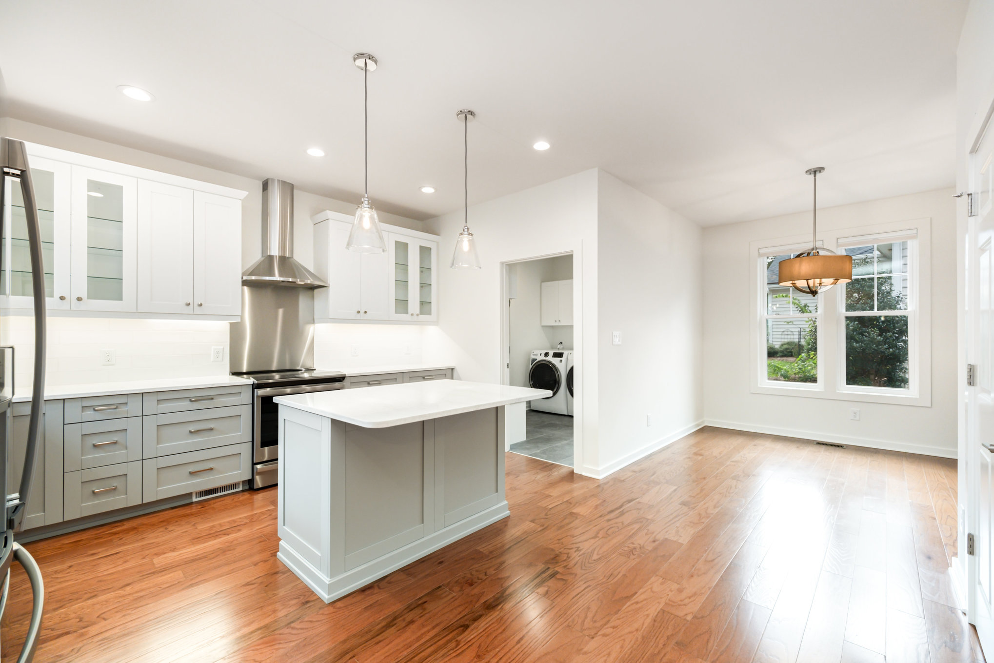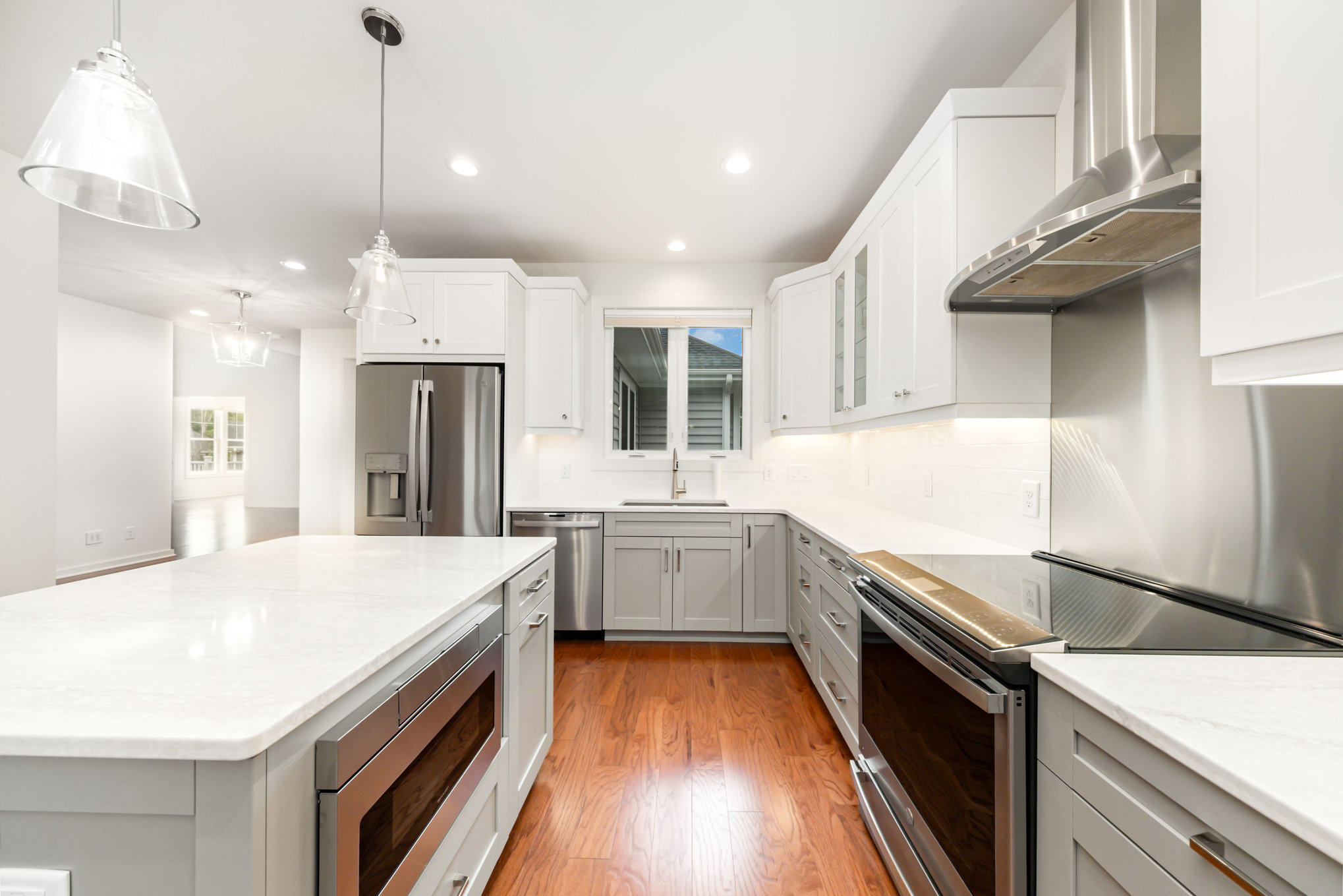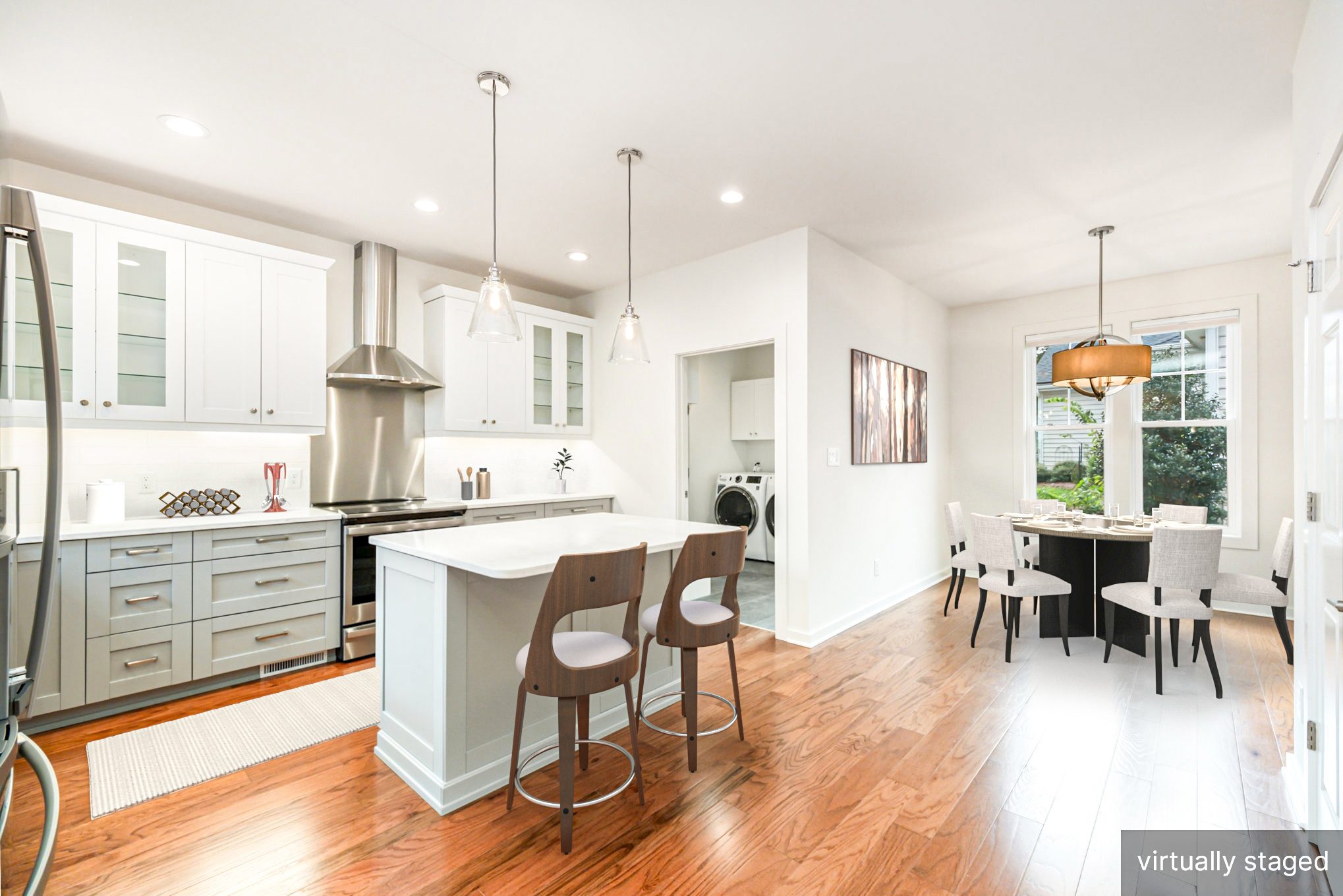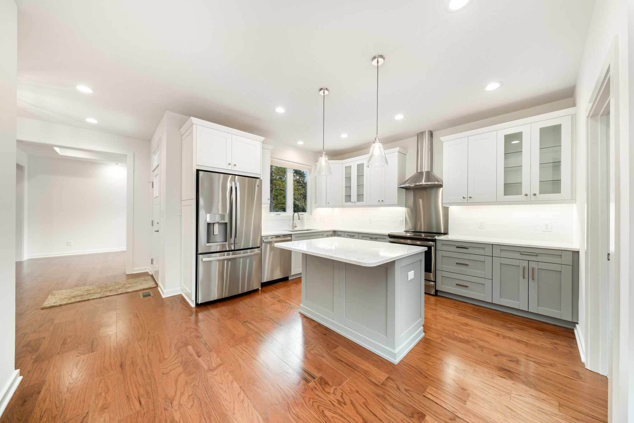 open to a sunroom and an adjoining dining room. The kitchen has soft-close
