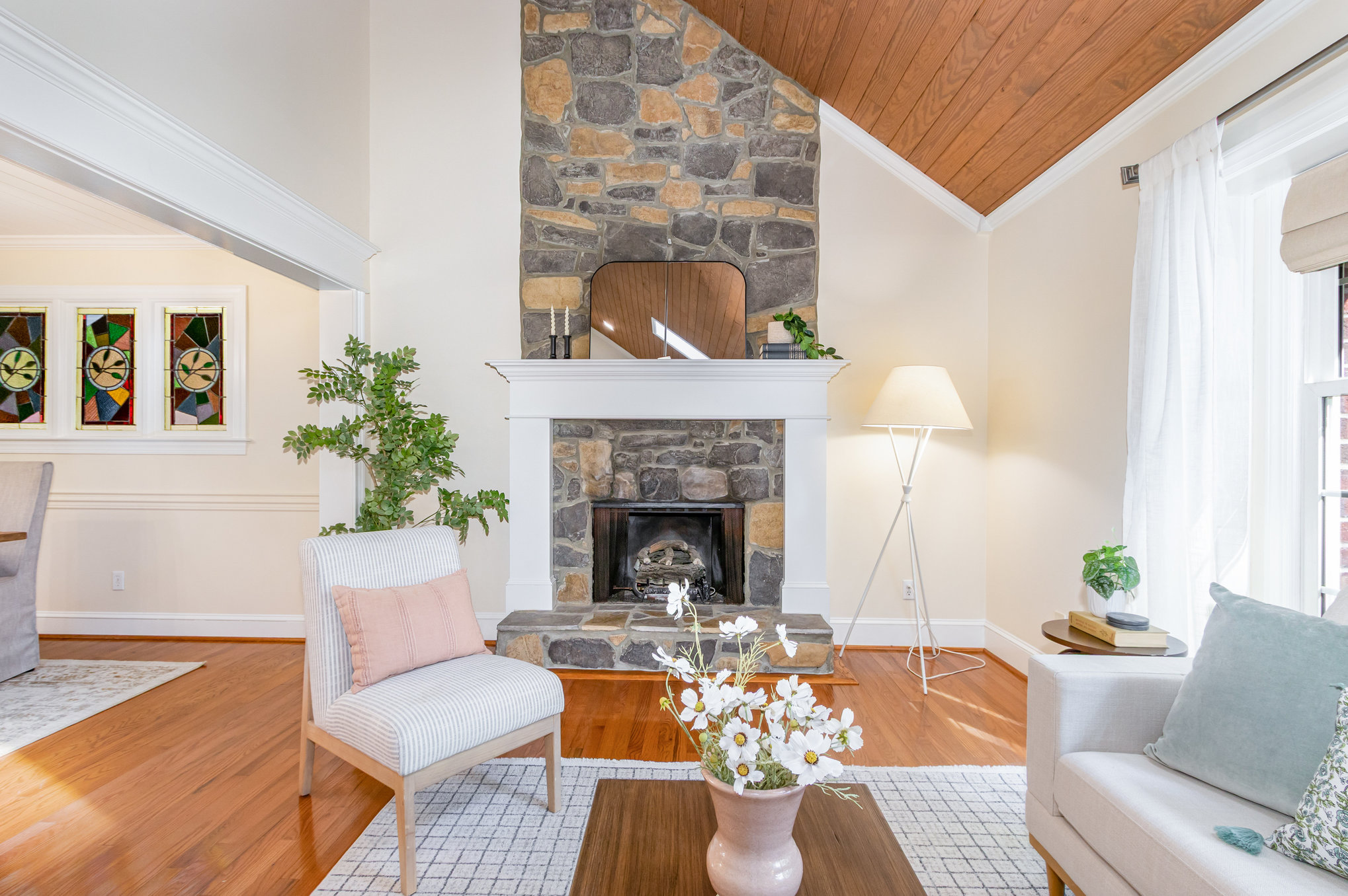 the rear of the main level. This space has many windows, some stained-glass,