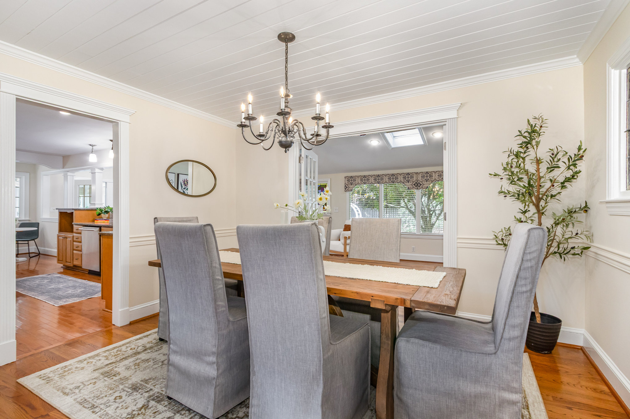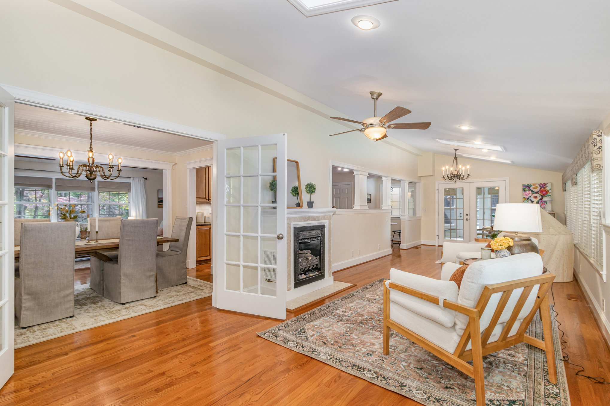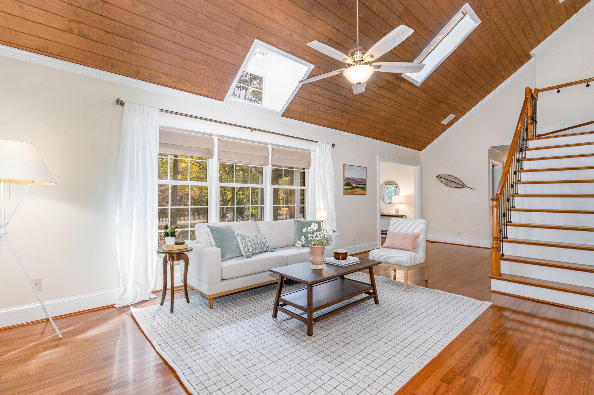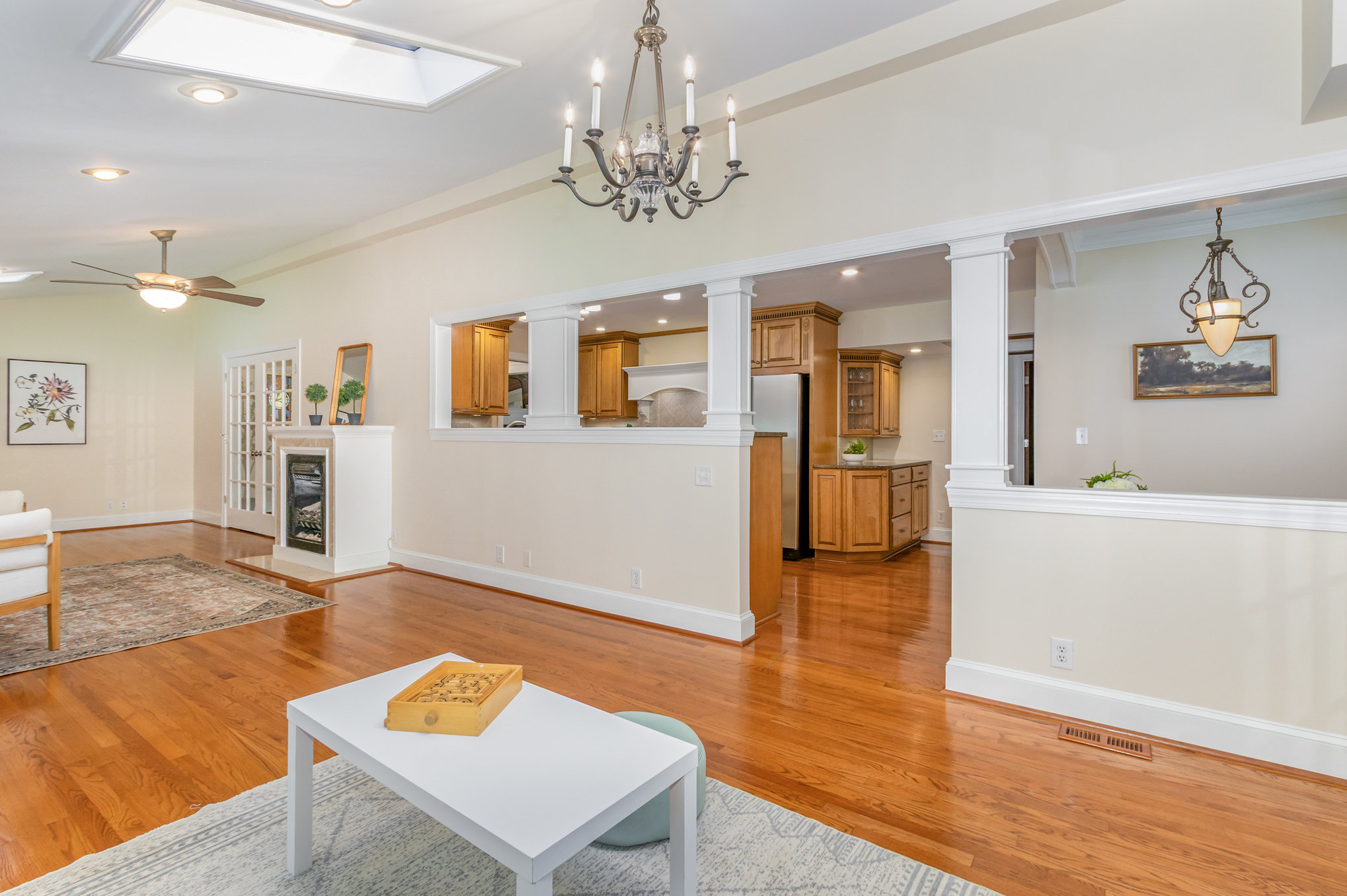 spaces, high ceilings, skylights, large windows, hardwood flooring throughout many