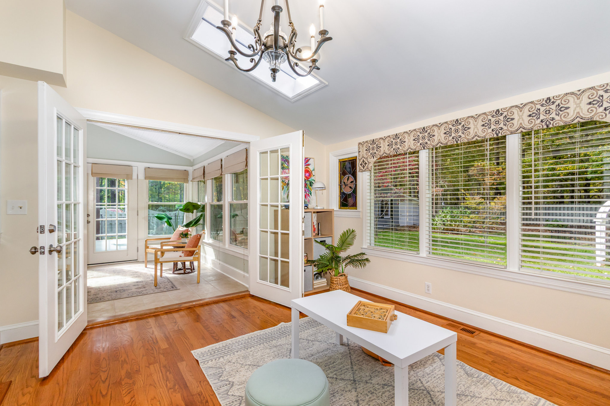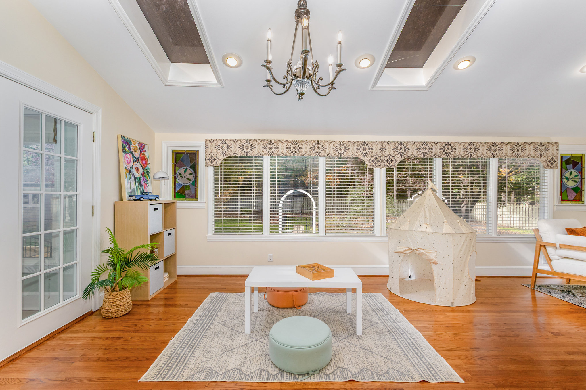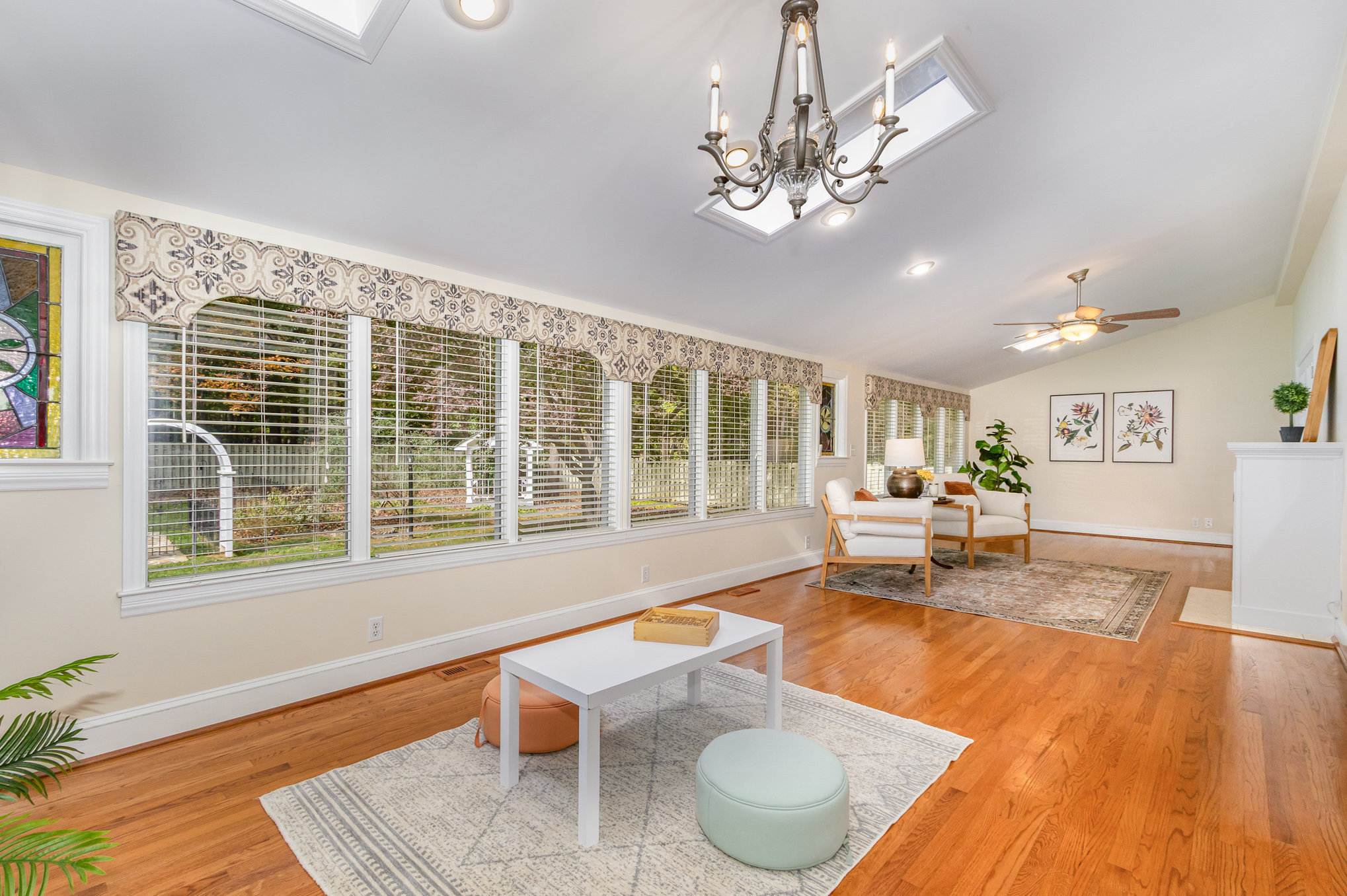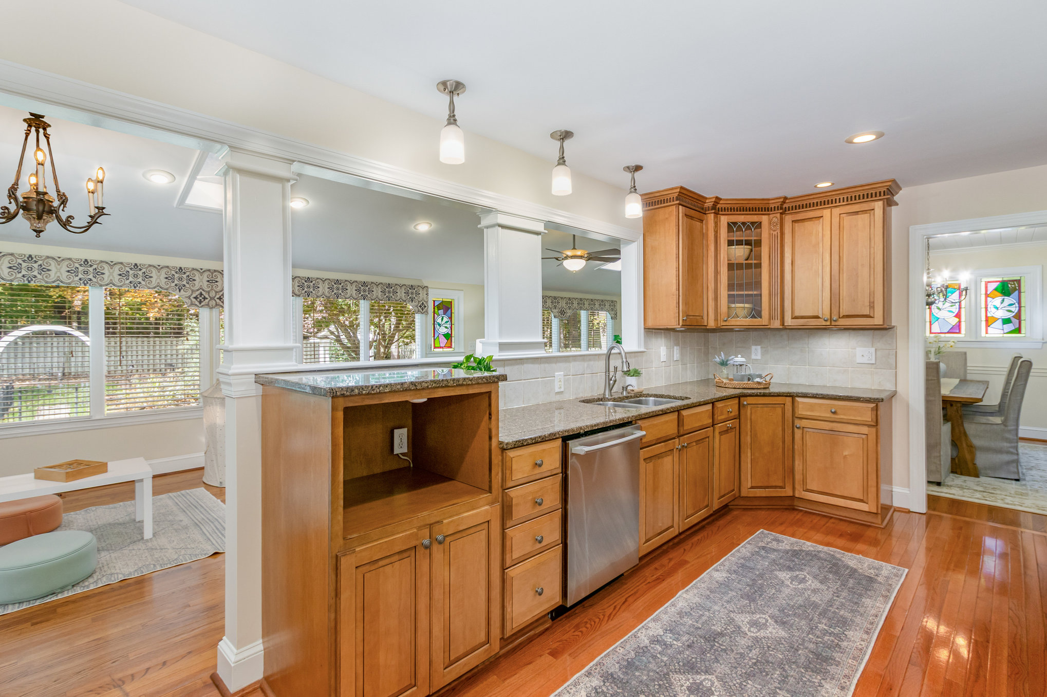 Adjoining the kitchen is the dining room with lovely stained-glass windows. A large family room and sunroom are found at