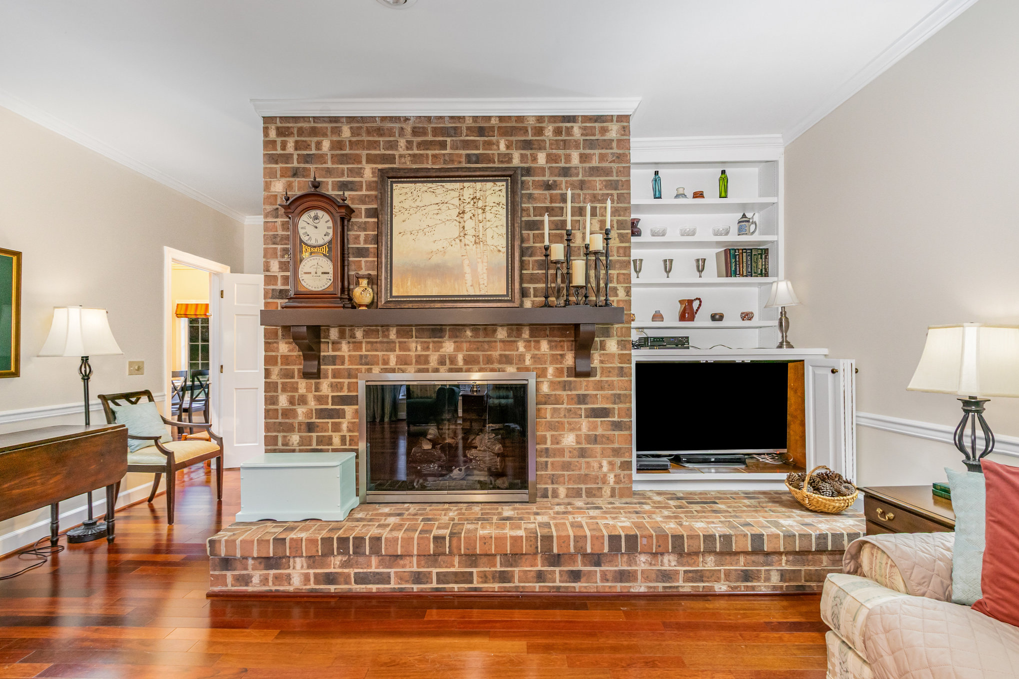 room features a gas fireplace, built-in shelving and many windows overlooking